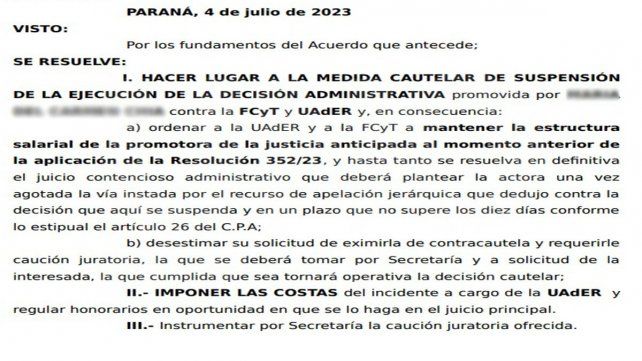 Lo cierto es que recientemente la justicia hizo lugar al pedido de la trabajadora. Según el fallo al que accedió UNO, el 4 de julio la Cámara en lo Contencioso Administrativo de Paraná, integrada por los jueces Adriana Acevedo, Marcelo Baridón y Hugo Rubén González Elías (se abstuvo de votar), hicieron lugar a la medida cautelar de suspensión de la ejecución de la decisión administrativa y, en consecuencia, ordenó "a la Uader y a la FCyT a mantener la estructura salarial de la promotora de la justicia anticipada al momento anterior de la aplicación de la Resolución 352/23, y hasta tanto se resuelva en definitiva el juicio contencioso administrativo que deberá plantear la actora una vez agotada la vía instada por el recurso de apelación jerárquica que dedujo contra la decisión que aquí se suspenda y en un plazo que no supere los diez días conforme lo estipual el artículo 26 del C.P.A".