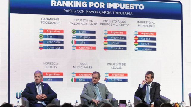 "La presión fiscal sobre el sector formal ubica a la Argentina primera en tres de los principales impuestos: Ganancias de sociedades, Débitos y créditos, y Patrimonios", mencionó. Mientras, proyectaba un "ranking" impositivo sobre el escenario, ante la mirada impávida del ministro y candidato Massa.