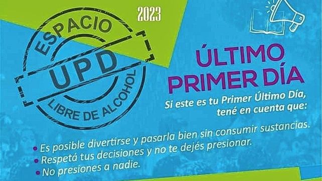 Los afiches indican la consigna "UPD: Espacio libre de alcohol" y señalan: "Si este es tu Primer Último Día, tené en cuenta que todo consumo de alcohol en menores de 18 años tiene consecuencias para la salud física y mental". Además, se agrega: "El cuerpo está en crecimiento y es vulnerable a sus efectos y aumenta el riesgo de dependencia en la adultez".