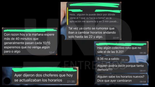 Asimismo los pasajeros que forman grupos de Whatsapp de cada línea para informar el recorrido de cada unidad, frecuencia, paradas y horarios indicaron que, al consultar a los choferes por los motivos de esta problemática, estaría en vigencia un nuevo horario de circulación que habría comenzado a regir a partir de esta semana en la capital entrerriana. Además, algunas líneas comenzarían a tener una frecuencia de 40 a 45 minutos por "falta de pasajeros".