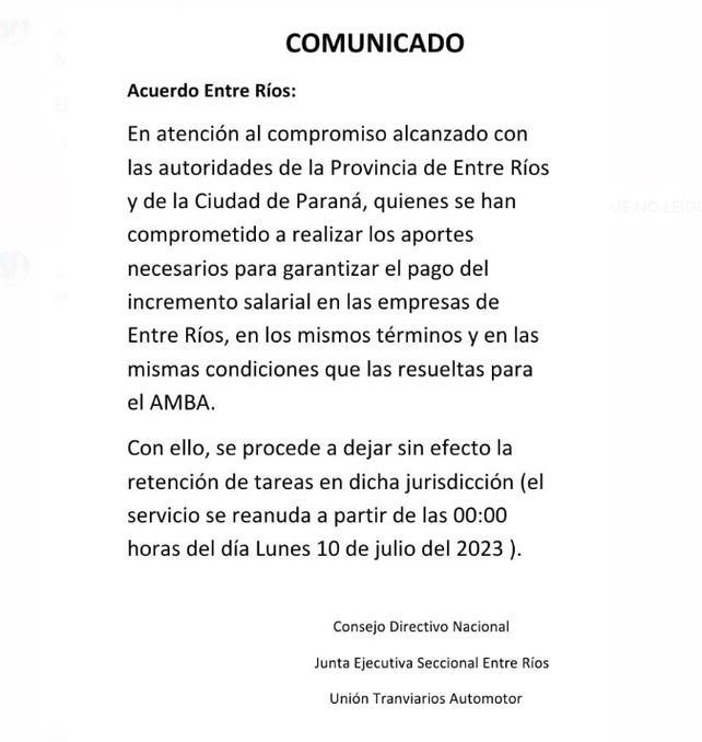 El conflicto se había destrabado en Buenos Aires, pero se mantenía en Paraná habida cuenta que los choferes seguían reclamando el pago de la mejora salarial acordada en paritaria. En medio de las medidas de fuerza, se conoció que el gobierno entrerriano abonó los fondos comprometidos para el sector.