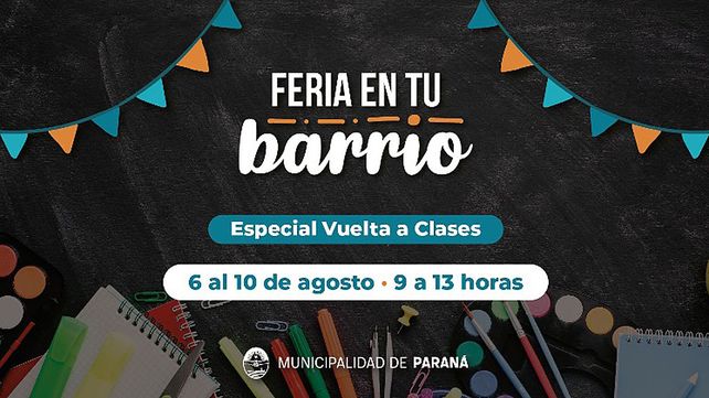 Esta semana se realizará una nueva feria barrial con útiles escolares a precios económicos en Paraná. Será del 6 al 10 de agosto en el marco de la Feria en Tu Barrio, especial Vuelta a Clases. Impulsada por el Municipio, estará en diferentes puntos de la ciudad. Habrá kits para escuela primaria y secundaria.
