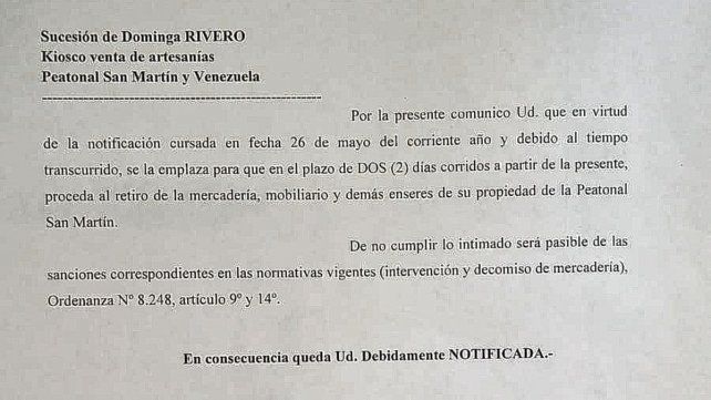 La notificación de la Dirección General de Habilitaciones Concesiones y Uso de Espacios Públicos de la Municipalidad de Paraná entregada a los comerciantes dice que "en virtud de la notificación cursada en fecha 26 de mayo del corriente año y debido al tiempo transcurrido, se le emplaza para que en el plazo de dos días corridos a partir de la presente, proceda al retiro de la mercadería, mobiliario y demás enseres de su propiedad de la Peatonal San Martín. De no cumplir lo intimado será pasible de las sanciones correspondientes en las normativas vigentes".
