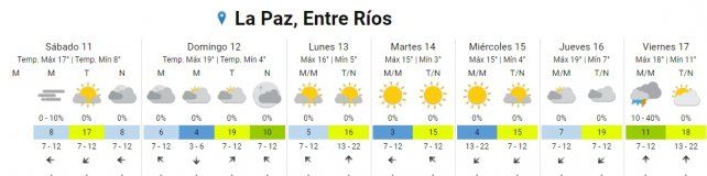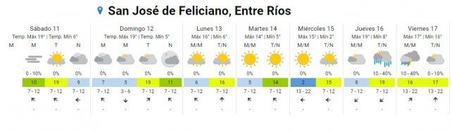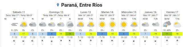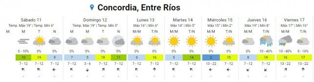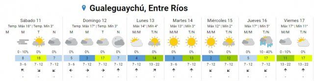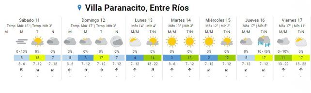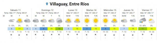 El jueves el cielo estará mayormente nublado por la mañana y nublado por la tarde con leve ascenso de las temperaturas que se ubicarán entre los 7º C y 19º C. En algunas zonas de la provincia, sobre todo en la costa del Río Uruguay, se desarrollarán tormentas aisladas.