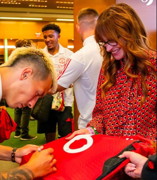 La célebre actriz de 55 años, ganadora de un premio Óscar y tres Globo de Oro, aprovechó la estadía de los Diablos Rojos en el país de Norteamérica para ir a saludar a los jugadores del equipo por el cual simpatiza. La protagonista de Mujer Bonita y Erin Brockovich, entre otras exitosas películas, se sacó fotos con los integrantes del plantel del United y se llevó un regalo de parte del defensor argentino Lisandro Martínez.