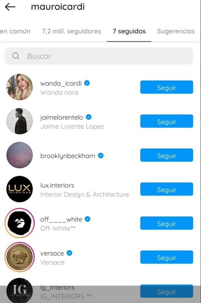 Icardi solo sigue siete cuentas la de Wanda, Jaime Lorente López, el actor que hace de Denver en La Casa de Papel; Brooklyn Beckham, el hijo mayor del ex futbolista inglés; dos importantes empresas de diseño y arquitectura; y dos prestigiosas marcas de moda e indumentaria.
