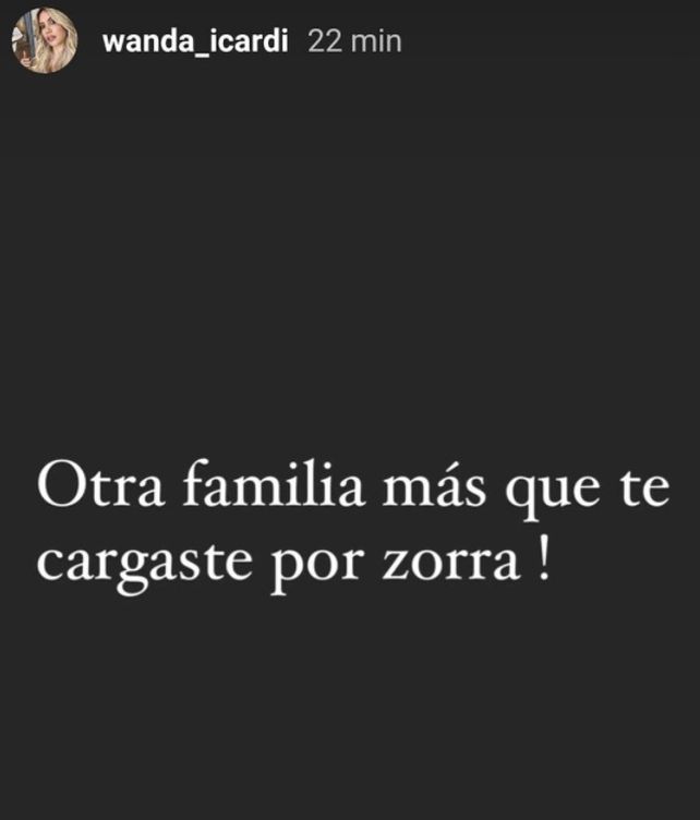 Después de una seguidilla de fotos familiares, Wanda se despachó en Instagram con una tajante afirmación: “Otra familia más que te cargaste por zorra”. Acto seguido dejó de seguir a su marido y la China Suárez y eliminó todas las fotos con él.