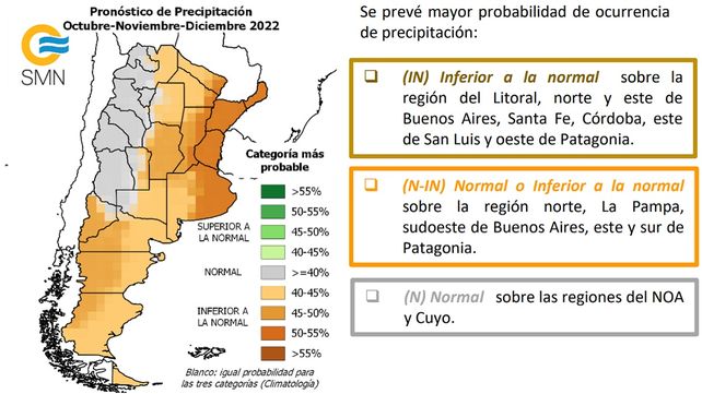 La situación de lluvias inferiores a lo normal se dará en la región del Litoral, norte y este de Buenos Aires, Santa Fe, Córdoba, este de San Luis y oeste de Patagonia. El mapa muestra a la provincia de Entre Ríos con 50% a 55% de probabilidad de tener menos precipitaciones.