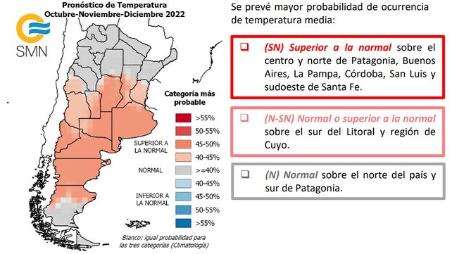 "Sobre gran parte del centro y norte del país no se descarta una mayor frecuencia de temperaturas máximas extremadamente altas. Se recomienda mantenerse actualizado con los pronósticos de menor escala incluyendo el Sistema de Alerta por temperaturas extremas", advierte el organismo nacional.