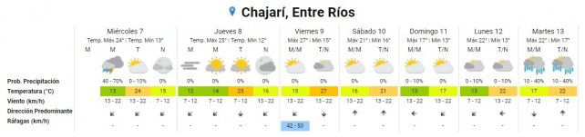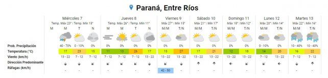 Para todo Entre Ríos están pronosticadas tormentas aisladas durante la mañana. Por la tarde el cielo a volvería a estar parcialmente nublado y se mantendría así en la noche. En la provincia las mínimas y máximas se ubican en torno a los 13° y 24°, respectivamente.