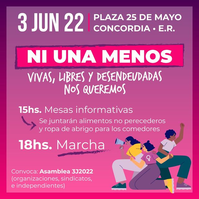 En tanto se pidió colaborar con alimentos no perecederos y/o ropa de abrigo para los comedores populares. Las consignas de la Asamblea por 3J 2022 son: #NiUnaMenos #3J #VivasLibresYDesendeudadas #LaDeudaEsConNosotras
