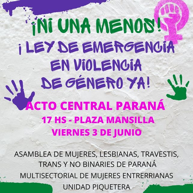 "Este viernes seguimos diciendo NI UNA MENOS a siete años de el primer #3J y seguimos en las calles. Volvemos a habitar la plaza Mansilla a partir de las 17 . Alzamos la voz pidiendo la ley de emergencia. Basta de matarnos. Basta de precarizarnos. Nos Vemos Ahí, indica el escueto comunicado de la Asamblea de Mujeres, Lesbianas, Travestis, Trans y no binaries de Paraná.