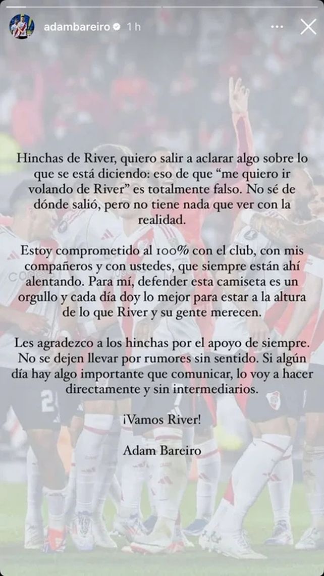 “Eso de que ‘me quiero ir volando de River’ es totalmente falso”, posteó Adam Bareiro en su cuenta de Instagram.