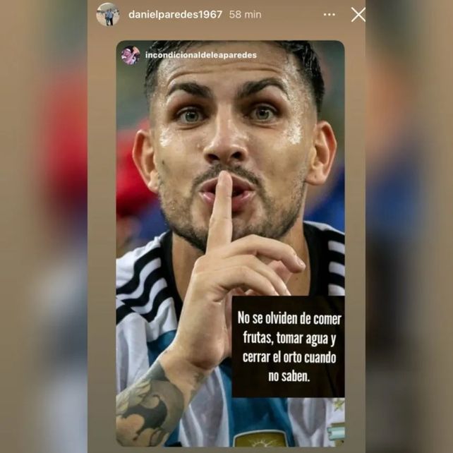 "No se olviden de comer frutas, tomar agua y cerrar el orto cuando no saben", replicó el papá de Leandro Paredes junto a una foto del volante pidiendo silencio.