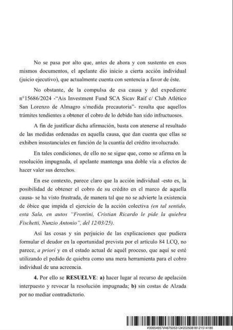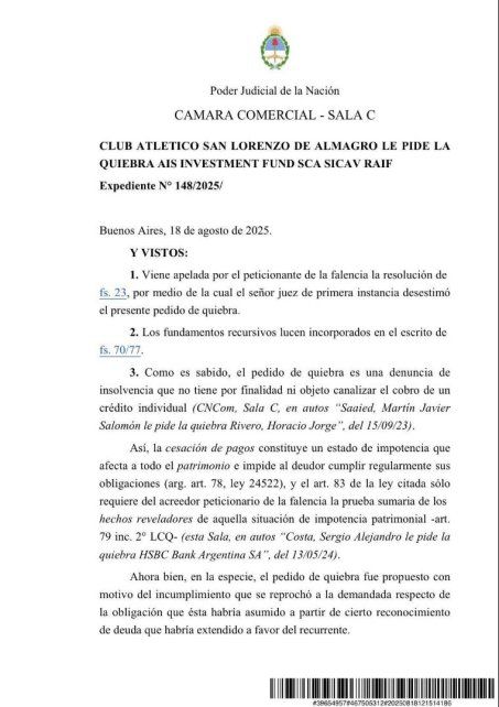 Aunque el fondo y el club habían alcanzado previamente un acuerdo con un plan de pagos para saldar la deuda, el incumplimiento por parte de San Lorenzo reactivó nuevamente el pedido de quiebra.