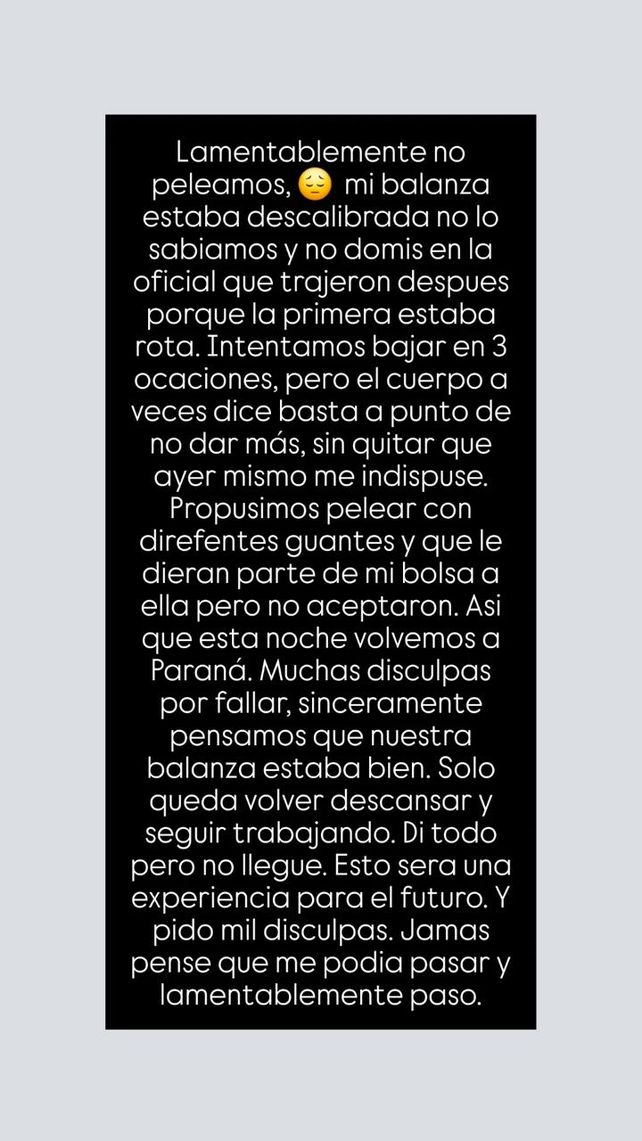Sin embargo el viernes, el día de la pelea, finalmente les informaron que el duelo se caería, lo cual generó una importante desazón en Cinthia y su equipo.