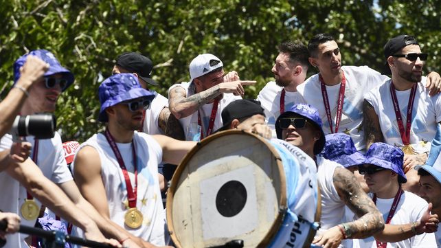 Messi y sus compañeros, entre ellos el entrerriano Lisandro Martínez, en la caravana de la gloria.