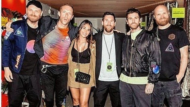 En los camarines se fotografió con el líder y vocalista Chris Martin y toda la banda.