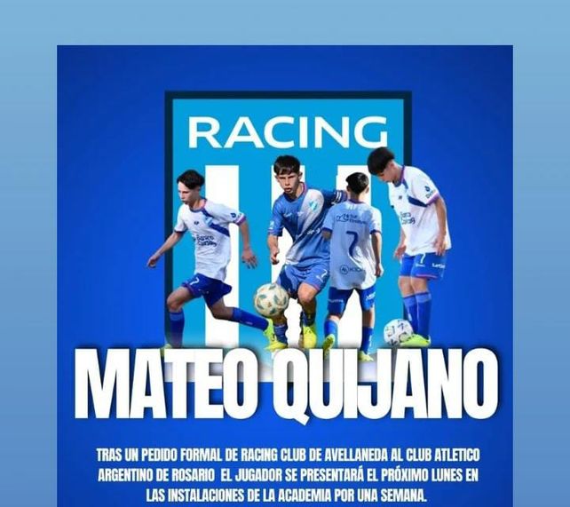 El Club Atlético Argentino de Rosario indicó a través de sus redes sociales que "Racing Club ha solicitado formalmente la concurrencia de Mateo Quijano, jugador de la sexta división de AFA (2008), para entrenar durante una semana en dicha Institución".