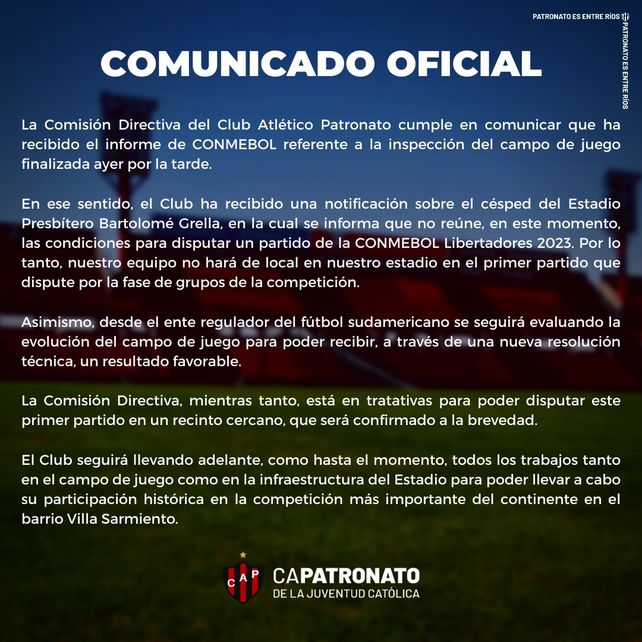 La Confederación Sudamericana de Futbol (Conmebol) no aprobó el Estadio Presbítero Bartolomé Grella para disputar el primer partido de Patronato por Copa Libertadores 2023. De esta manera, el Rojinegro hará de local en otra cancha y posiblemente pueda disputar la segunda y tercera fecha en la capital entrerriana.