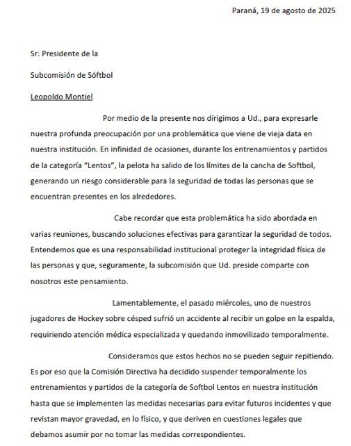 En una carta dirigida a Leopoldo Montiel, presidente de la Subcomisión de Sóftbol, se detalla la preocupación por una problemática de larga data: las pelotas de sóftbol suelen salir de los límites de la cancha durante los partidos y prácticas. Esta situación se volvió aún más alarmante tras un reciente incidente en el que un jugador de hockey sobre césped recibió un pelotazo en la espalda, lo que requirió atención médica y lo dejó inmovilizado por un tiempo. La ubicación de ambas canchas complica la práctica en simultaneo de ambos deportes. El sóftbol fue de los primeros en el predio y luego fueron llegando otros deportes, que sumó socios y crecimiento al club. Ahora poco espacio es un problema para las disciplinas.