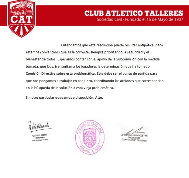La carta de la dirigencia de Talleres