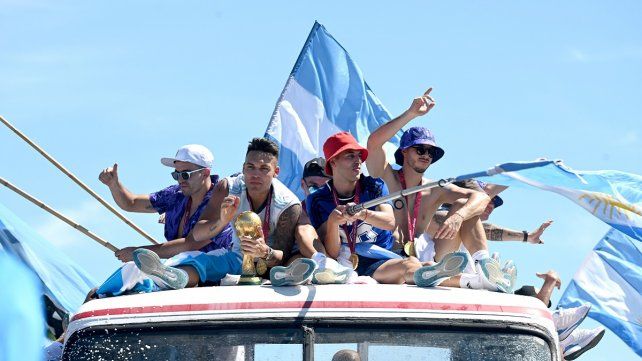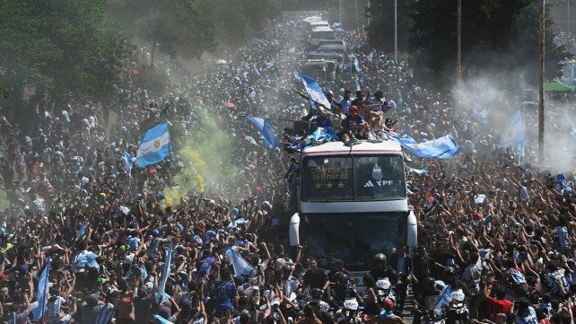 La caravana por tierra se inició en el predio de la AFA en esa localidad bonaerense minutos antes del mediodía y debió finalizar antes de completar su recorrido por la gran cantidad de gente que se hallaba sobre la autopista. Encabezados por Lionel Messi, Rodrigo De Paul y Enzo Fernández, los campeones del mundo fueron trasladados en el micro de la empresa Plusmar hasta la escuela de cadetes Pirker de la Policía Federal Argentina, en Villa Lugano, donde abordaron helicópteros policiales y de la Prefectura Naval.