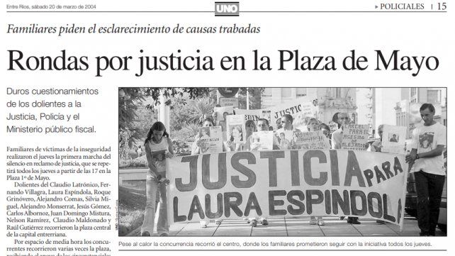 A inicios de 2004 se iniciaron las “rondas por justicia” en la Plaza 1° de Mayo, con familiares de decenas de víctimas que luego hacían oír sus reclamos ante el Poder Judicial. Allí estaban, entre otros, madres, padres, hermanos y amigos de Alejandro Comas, el remisero Roque Grinóvero, Raúl Gutiérrez, Nelson Ramírez, el canillita Claudio Latrónico y Laurita Espíndola. Conformaron, más tarde, la Asociación Vida Entre Ríos (Vidaer). Algunos han logrado justicia, otros siguen esperando o ni siquiera esperan.