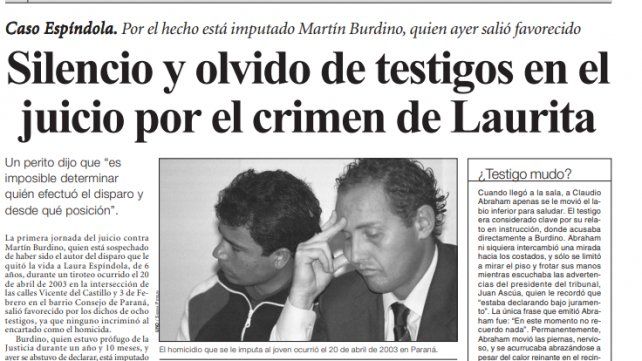 “La segunda muerte de Laurita” fue el título de la crónica del día de la sentencia. Cuando se leyó el veredicto de absolución, gritos y llantos de la madre y familiares de Laura Espíndola retumbaron en los pasillos de Tribunales, y muchos se agolparon para intentar agredir a Burdino. Aquel 8 de julio de 2005 se terminó de quebrar la confianza de la sociedad en la Justicia: “Operadores y funcionarios no pudieron, no supieron o no quisieron enderezar el curso de esta historia”, describe el artículo de UNO.