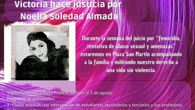 Por su parte, la Querella Feminista del Movimiento de Mujeres, Diversidades y Feminismos de Victoria convocaron desde este lunes hasta el viernes inclusive, mientras se sustancie el juicio por jurados, a congregarse en la plaza San Martín y acompañar a la familia de Noelia y militar el derecho a "una vida sin violencia"