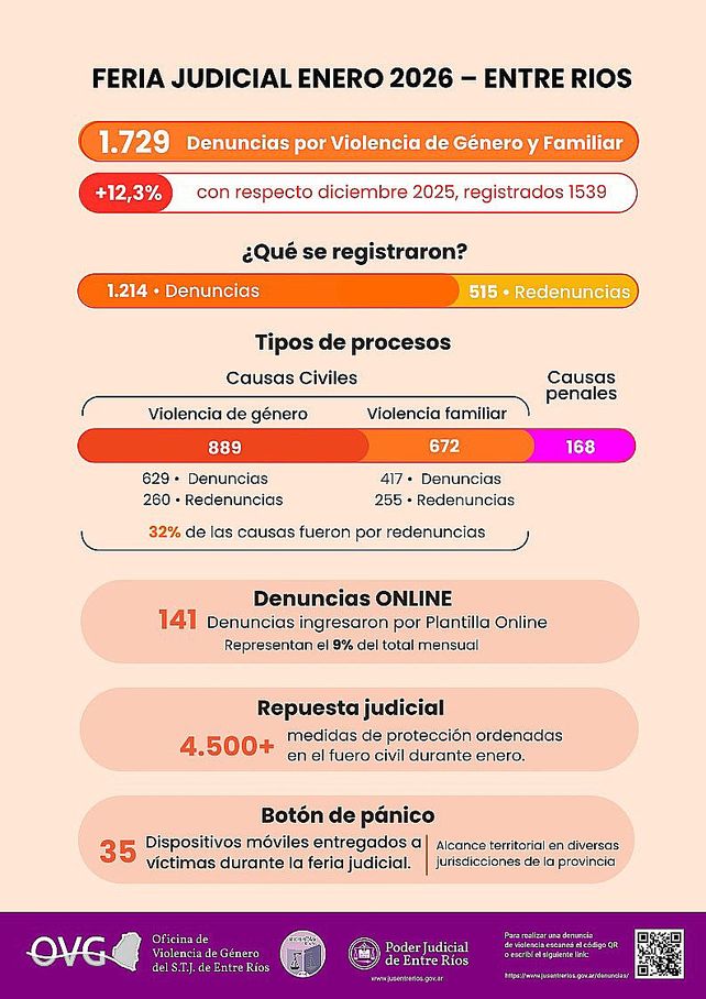 Durante la feria judicial de enero de 2026 se registraron 1.729 denuncias por violencia de género y familiar en la provincia de Entre Ríos, según datos relevados por la Oficina de Violencia de Género del Superior Tribunal de Justicia. La cifra representa un incremento del 12,3% en comparación con diciembre de 2025, cuando se habían contabilizado 1.539 presentaciones.