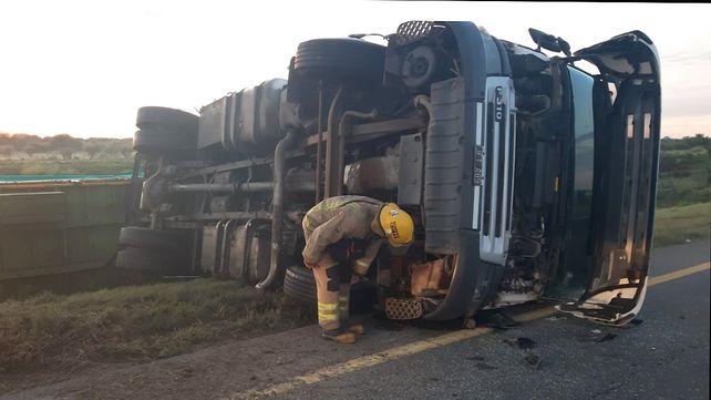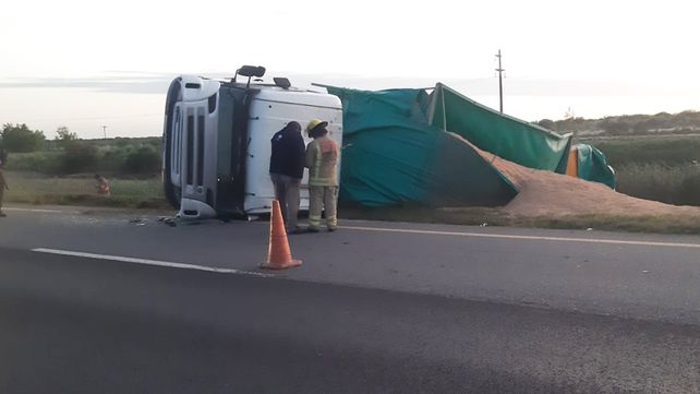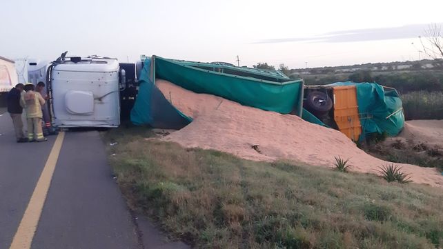 Un camión cargado con cereales volcó en la mañana de este miércoles en el kilómero 4 de la Autovía 14, en el sentido norte - sur. Por motivos que se tratan de establecer el conductor perdió el control del vehículo que quedó sobre eno de sus laterales en la banquina con la carga volcada.