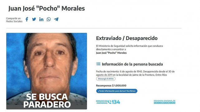 El caso Pocho Morales es uno de los grandes misterios que ni la Policía ni la Justicia pudieron resolver. El pasado 30 de agosto se cumplieron 11 años de la desaparición del quinielero de San Jaime de la Frontera y ahora el Ministerio de Seguridad de la Nación resolvió elevar la recompensa para quien aporte información que permita esclarecer el caso, a la suma de 1 millón de pesos.