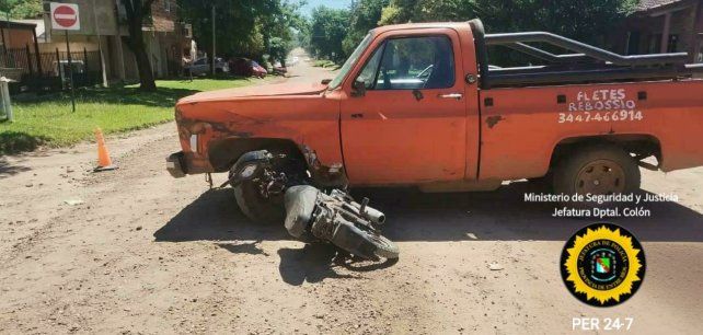 Otro grave accidente en Colón se registró este martes al mediodía, precisamente en calles Bolívar y Araujo Penón. Allí, colisionaron una camioneta marca Chevrolet, modelo P-UP C-10 Silverado, conducida por un hombre de 41 años y una motocicleta marca Gilera, modelo Smash 110 cc, guiada por un ciudadano de Pueblo Liebig, de 41 años.