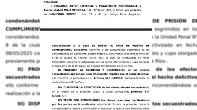 El joven Mendoza admitió el delito en el marco de un juicio abreviado y aceptó cumplir 9 años de prisión efectiva por el delito de homicidio simple. Fue alojado en la Unidad Penal N° 8 de la ciudad de Federal.