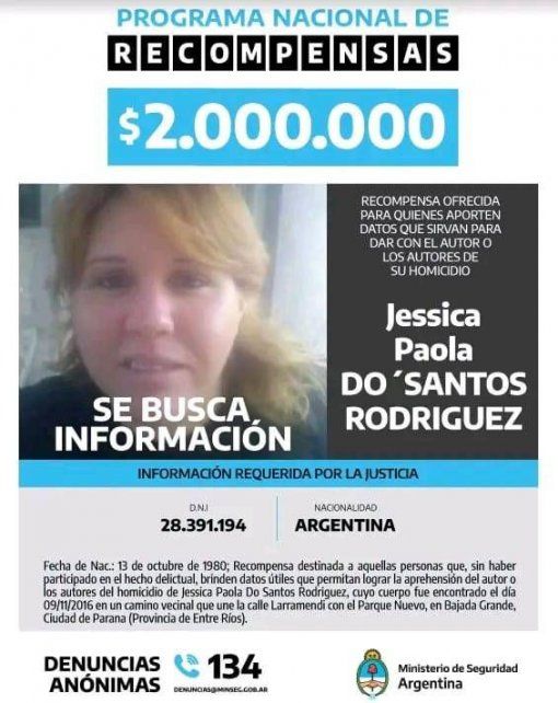 El Ministerio de Seguridad de la Nación elevó a 2.000.000 de pesos la recompensa para quien aporte "datos útiles que permitan dar con el autor y o autores del homicidio" de Jéssica Paola Do' Santos. Su cuerpo fue encontrado el 9 de noviembre de 2016, en un sendero del Parque Varisco, en Paraná.