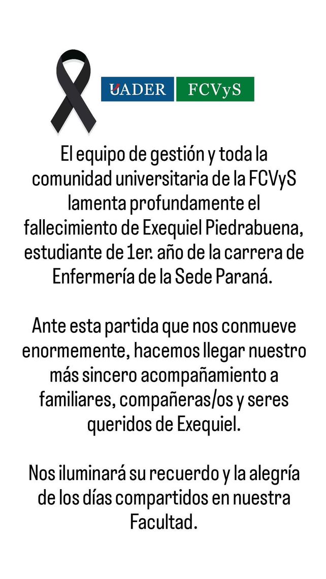 Un joven motociclista falleció este miércoles por la mañana en la ciudad de Paraná, convirtiéndose en la primera víctima fatal por siniestros viales en lo que va de 2026 en la capital entrerriana. La víctima, Exequiel Alejandro Piedrabuena, era estudiante de la Facultad de Ciencias de la Vida y la Salud de la Uader, que lo despidió públicamente tras su fallecimiento.