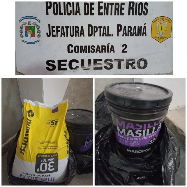 Se precisó que "en su poder tenían dos bolsas negras de consorcio, dentro de las cuales había un balde de masilla de 32 kilos y una bolsa de masilla de 25 kilos de secado rápido".