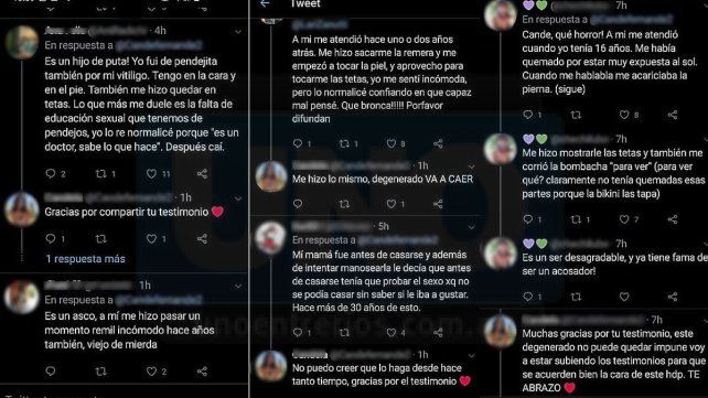 “Yo me hice atender con él hace más de un año. Nunca supo decirme qué tenía. En la consulta empezó a mirarme raro y vi en un momento que me miró las tetas, me preguntó sobre unos granitos que tenía y cuando me di vuelta me tiró del vestido y me miró todo! Nunca más volví con ese hdp”, Fue otro de los testimonios.