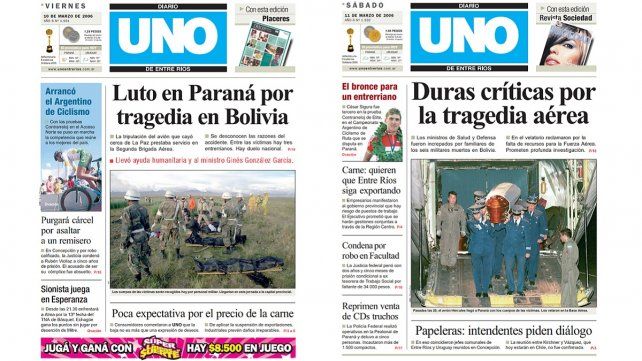 La nave había trasladado al vecino país al entonces ministro de Salud de la Nación, Ginés González García. Todos los tripulantes y pasajeros, que prestaban servicios en la capital entrerriana, fallecieron.