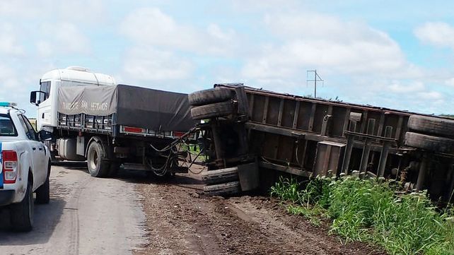 Por motivos que se intentan establecer el acoplado terminó en la banquina. La ruta quedó parcialmente ocupada con el vehículo.