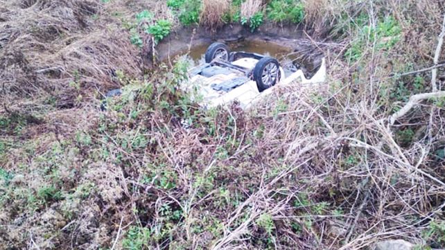 El rodado Citroën C3 quedó volcado completamente, en un cañadón rodeado de vegetación.