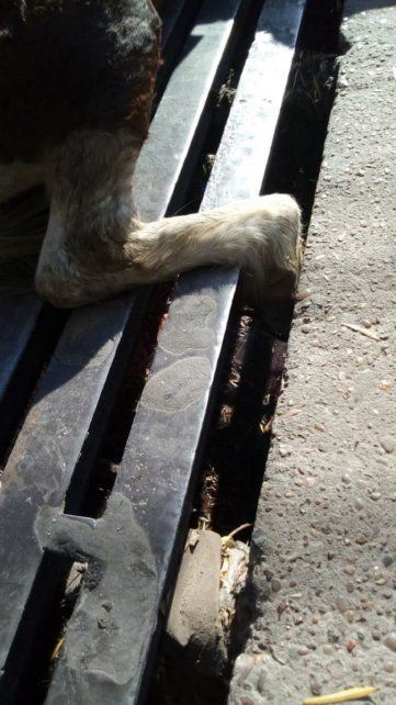 Este mediodía, con la intervención de una veterinaria, constató que los cortes y golpes provocaron un importante sangrado. Afortunadamente con equipos especiales, la boca de tormenta fue cortada, lo que permitió la liberación del potrillo que tenía signos evidentes de agotamiento, como también de mala alimentación.