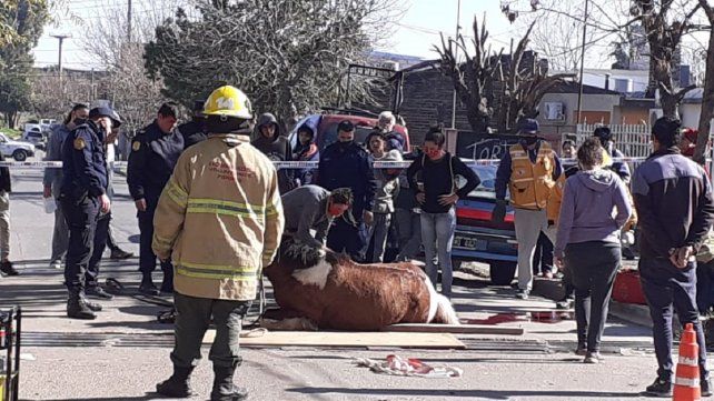 Por la tensa situación, en la cual el animal que traccionaba un carro por calle Acebal y Casiano Calderón le quedaron atrapadas las dos patas en la estructura de hierro, una gran cantidad de vecinos se acercó al lugar para ayudar a los bomberos y policías.