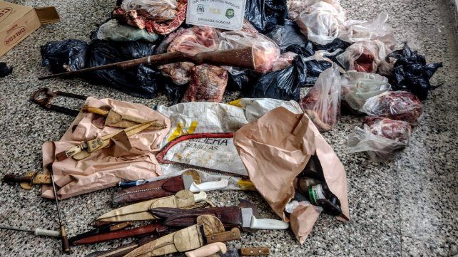 En uno de los procedimientos, se procedió al secuestro de 120 kilos de cortes cárnicos vacunos, una sierra con restos de carne, una escopeta calibre 20, cartuchería, municiones, elementos de recarga y fueron hallados restos de huesos frescos descarnados, coincidentes con el animal faenado que se hiciera mención en la denuncia radicada por el damnificado, además de elementos utilizados para la faena.