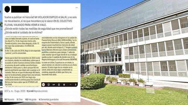 A través de sus redes sociales una joven oriunda de Viale denunció que a su violador, quien fue condenado a 10 años de prisión por abuso sexual, le otorgaron salidas transitorias y ella no fue debidamente notificada por la Justicia. "Es todo un chiste, la Justicia es un chiste, la salud mental y la vida de la víctima es un chiste, parece", afirmó.