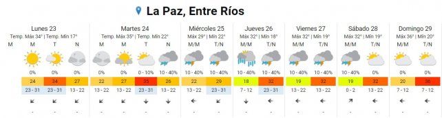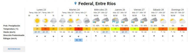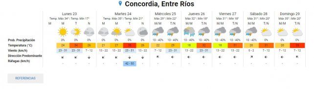En lo que respecta a Concordia la máxima pronosticada para hoy es de 34° donde el cielo estará despejado. Y para mañana martes se indica una jornada parcialmente nublada con 21° de mínima y 35° de máxima.