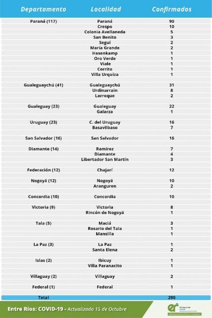 Este jueves se registraron 290 nuevos nuevos casos de coronavirus en Entre Ríos, principalmente en Paraná, aunque también se conocieron gran cantidad de contagios en los departamentos Gualeguaychú, Guleguay, Uruguay, San Salvador y Diamante, entre otros. La particularidad de la jornada fue que se encontraron casos positivos en 15 de los 17 departamentos entrerrianos.