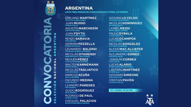 El entrenador citó en esta primera instancia solamente a los jugadores que se desempeñan en el fútbol del exterior e incluyó a varios nombres que profundizan la renovación que inició en su gestión. Uno de los casos es el del arquero Emiliano Martínez, que acaba de ser transferido del Arsenal de Inglaterra al Aston Villa y se convirtió en la venta más importante para un arquero argentino. Dibu ya había estado en el banco de suplentes albiceleste el año pasado en los amistosos ante Brasil, Ecuador y Alemania.