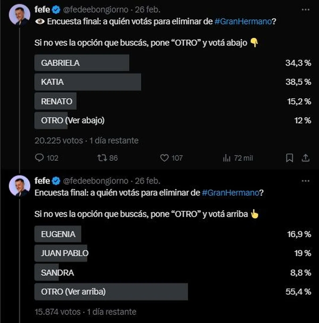 Desde la cuenta de @fedeebongiorno, en una encuesta donde votaron más de 20 mil personas, se estima que Katia sería la nueva eliminada con el 38,5% de los votos, mientras que Gabriela la seguiría con 34,3%. En tercer lugar, aparece Eugenia con el 16,9%.